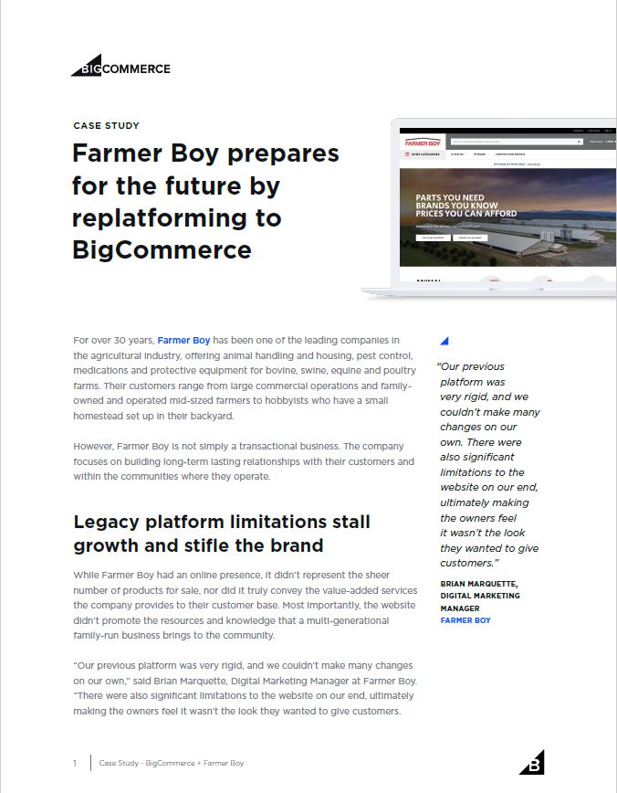 However, Farmer Boy is not simply a transactional business. The company focuses on building long-term lasting relationships with their customers and within the communities where they operate. Download this case study to learn more about how the BigCommerce platform solved the issues facing this well-established supplier of agricultural products and primed them for further growth. |
