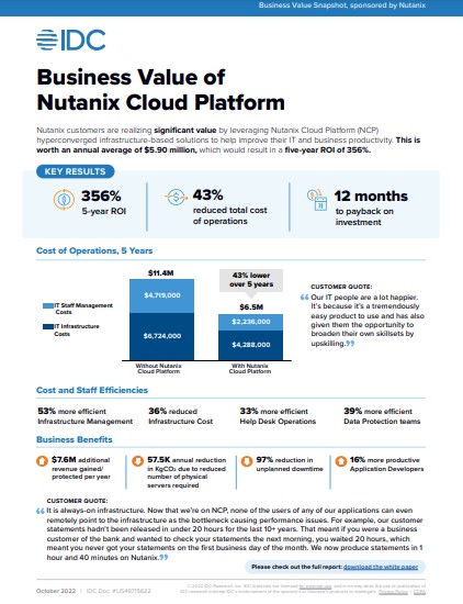 Learn how Nutanix customers are realizing significant value by leveraging Nutanix Cloud Platform (NCP) hyperconverged infrastructure-based solutions. |