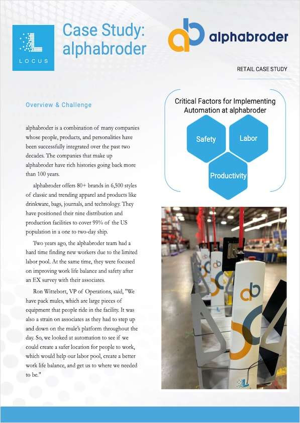 With over 100 years of rich history and a commitment to integrating diverse brands and products, alphabroder faced a significant hurdle: a shrinking labor pool and the need for improved work-life balance and safety for their associates. By partnering with Locus Robotics, they introduced autonomous mobile robots across their nine distribution and production facilities, covering 99% of the US population with swift delivery times. By automating, alphabroder gained these benefits: