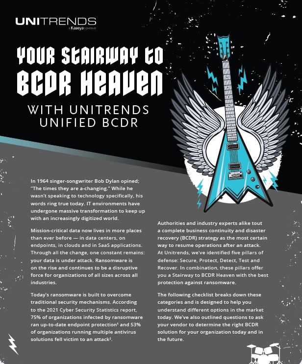 To help you fend off ransomware attacks, Unitrends has come up with a comprehensive checklist that highlights the five pillars of defense. In combination, these pillars offer you a stairway to BCDR heaven, empowering you to effectively detect, respond to, and recover from a ransomware or malware attack. Complete the form to download the Whitepaper. |
